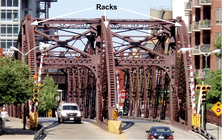 Distinguishing Features: Three Through Trusses; rack and pinion on the outside of the truss. (example shown below is the single leaf bridge at W. Kinzie St. spanning the North Branch of the Chicago River- photo taken looking west from N. Orleans St.)