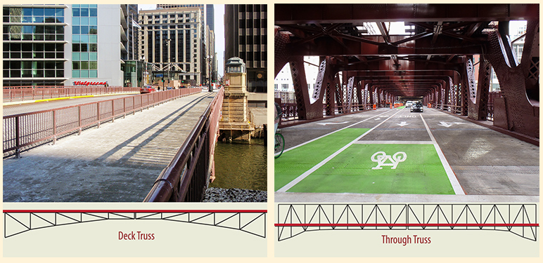 Through trusses, have all supporting members above the roadway (considered the least aesthetic). The bridge at N. Wells St. (right photo) is an example of a through truss.