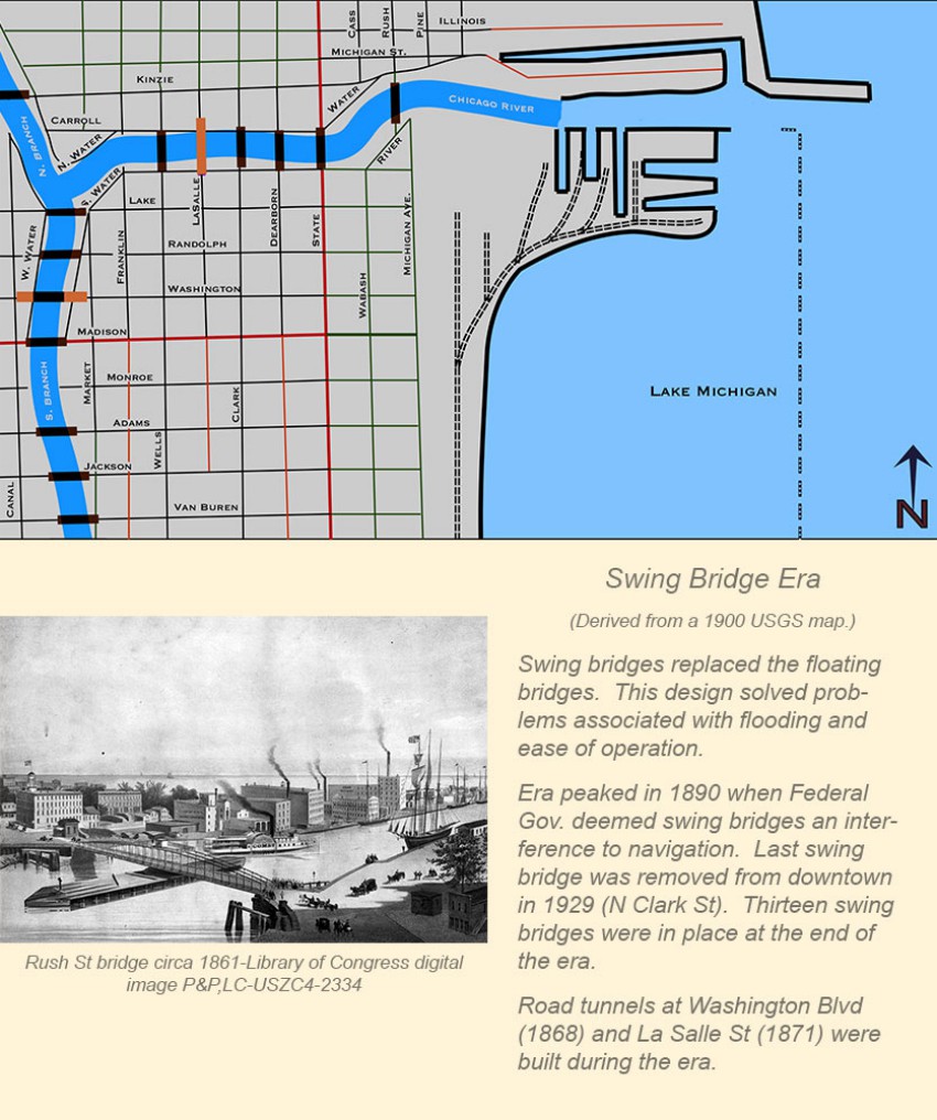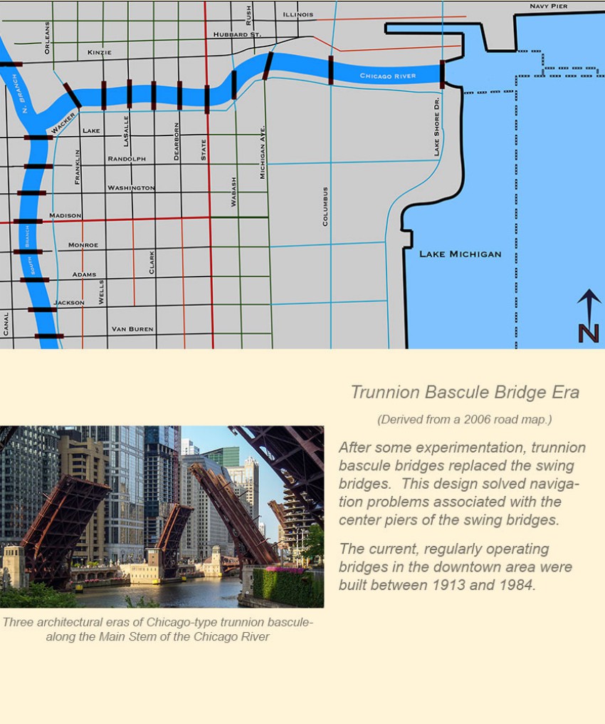 Chicago's movable bridge history can be broken down into roughly four time frames. The maps on this page present a map view and basic description of each era. Note that these maps present a picture at the end of each era.