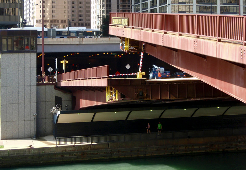 Repairs could have been made with the bridge in the down position allowing traffic use the new bridge. However, maritime law in effect on the Chicago River gives preference to the water-borne traffic which meant repairs were made with the bridge leaves raised, much to the chagrin of the landlubbers. The bridge was re-opened – and lowered for traffic in October 1983.