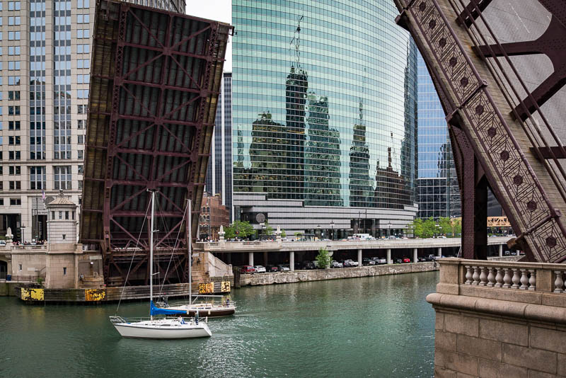 As with all of the older downtown bascules, this bridge was operated often for river traffic early in its life. In its first fourteen months it was operated 2,375 times. By the mid 20th Century large commercial river vessels migrated to the Calumet River. Today commercial traffic on the Chicago River consists of tour boats and a few tugs and barges which rarely need bridges raised. Now, in semi-retirement, the Franklin St bridge is operated about 40 times per year mostly for the seasonal sail boat runs between Lake Michigan and boat storage yards located on the South Branch.