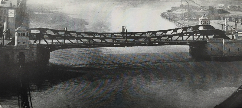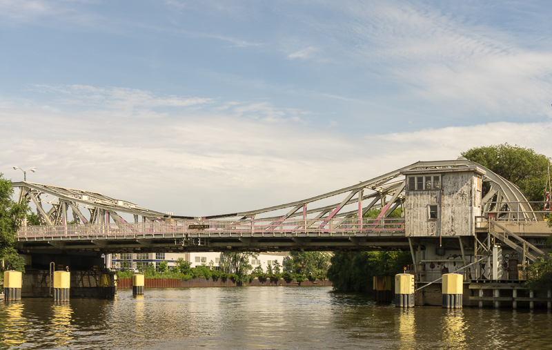 A first generation Chicago-type bridge was initially proposed (the Division St bridge across the North Branch, shown below, is an example). These bridges were characterized by simple wooden operator houses and significant structural support showing above the bridge deck – none of the aesthetic touches of the current downtown bridges.