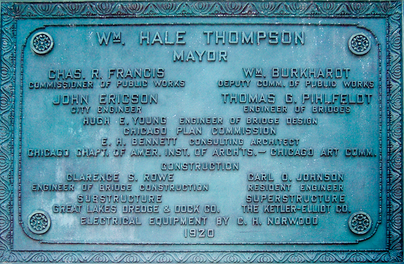 The early photograph shown of the completed bridge was provided in the 1920 Annual Report of the Chicago Public Works Department. The bridge plaque summarizes the organizations and individuals with major responsibilities in the project.