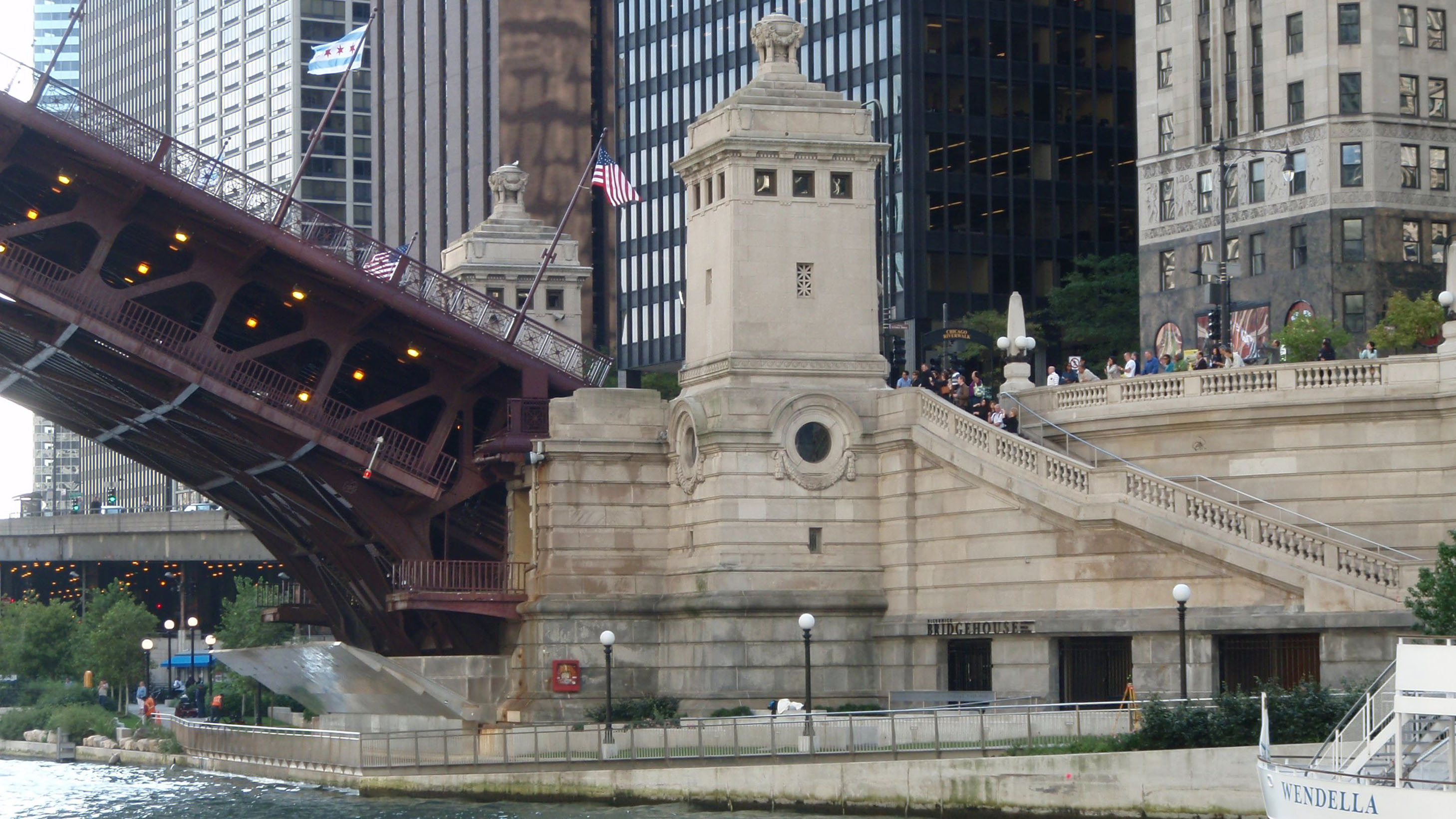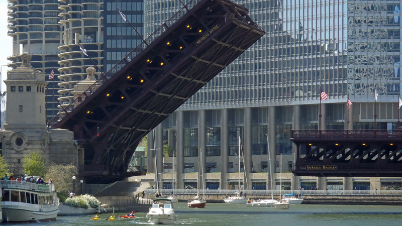 This bridge is considered by many to be the most spectacular of the 18 bridges. It has 4 ornate bridge tender houses. Each double-deck leaf is supported by 4 deck trusses. It is two bridges built side-by-side to allow one side to be open without blocking North Michigan Avenue off completely.
