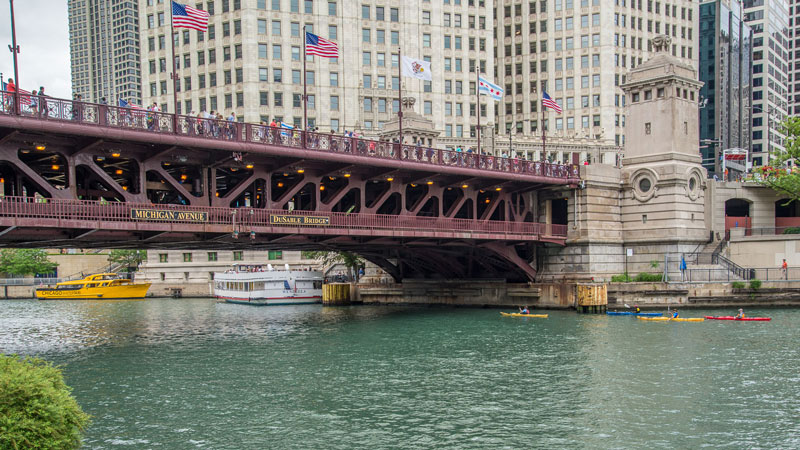 Different names have been proposed over the life of the iconic bridge. In 1921, the Chicago Historical Society suggested a name change to the “Marquette-Joliet Bridge.” In 1939, the Fort Dearborn memorial committee suggested to the city council that the bridge be named the “Fort Dearborn Bridge.” Both of these naming attempts were unsuccessful. In 2010, after a decade of effort, Friends of DuSable and the DuSable League convinced the city to rename the Michigan Avenue bridge as “DuSable Bridge” after the first non-native settler in the area, making it the seventh downtown bridge to honor a person, institution, or event.