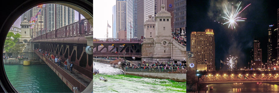 Fans crossing the bridge for the 2010 Stanley Cup parade (Left) - Dyeing the Chicago River green (Center) - Magnificent Mile lights Festival (Right)