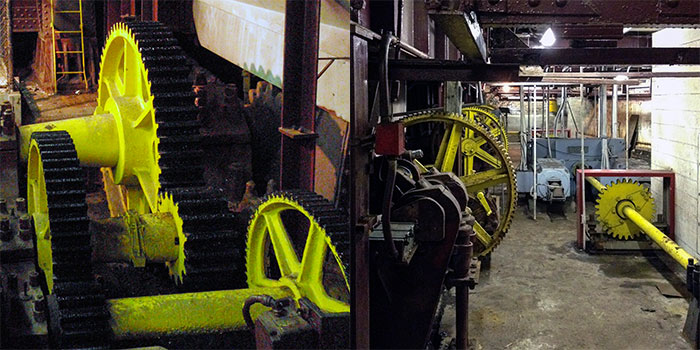 Drive gears (Left) - Heel locks, motors, clutch, and drive shaft (Right) - Inside the McCormick Bridgehouse & Chicago River Museum at the DuSable Bridge