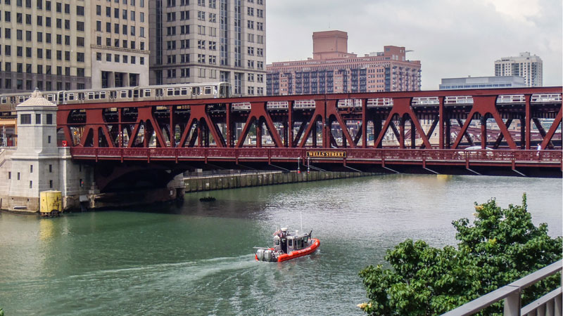 The river crossing at North Wells Street has a 170+ year history. The first river crossing at Wells Street was a floating bridge that was built in 1841, then rebuilt in 1847. The first swing bridge at this location was constructed in 1856. This bridge was destroyed in the Great Fire in 1871. A new swing bridge was in place by the end of 1872. In 1896 the Wells Street bridge was rebuilt by the Northwestern Elevated Road with an elevated rail line on a second deck.