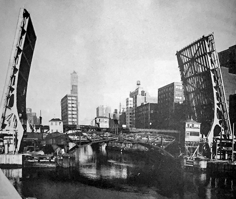 In the 166 year history of the Van Buren St. crossing, Chicago's movable bridge design evolved from movable pontoon spans to center pier swing bridges to bascules. This river crossing has seen representatives from all of these eras. The current Chicago-type trunnion bascule replaced a Scherzer rolling lift bascule built in 1895.
