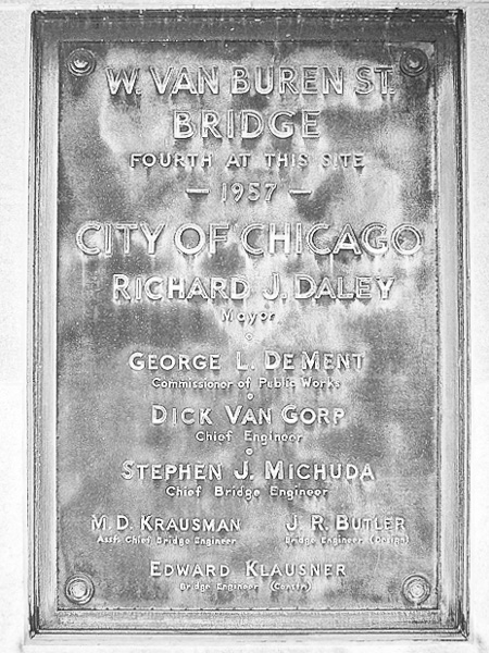 The bridge was dedicated in a ceremony including Mayor Daley and other top city officials on December 5, 1956. The bridge plaque lists the major players involved in the planning, design, and construction of the bridge.