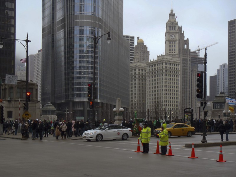 The crowd gathered to watch the river dyeing near State and Wacker.