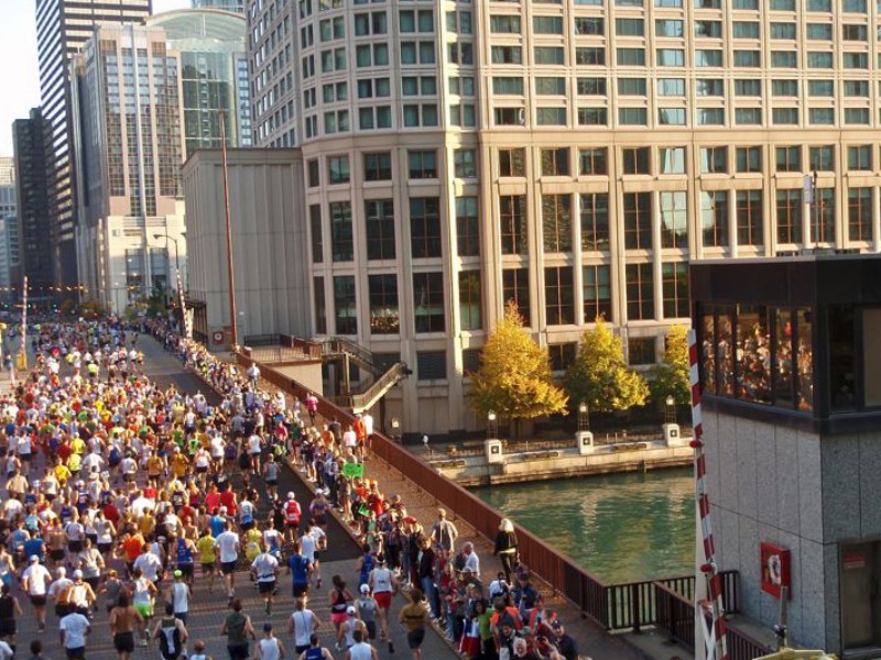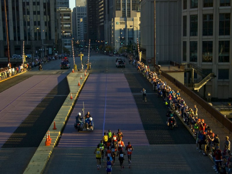 The Chicago Marathon underway at the N. Columbus Dr bridge