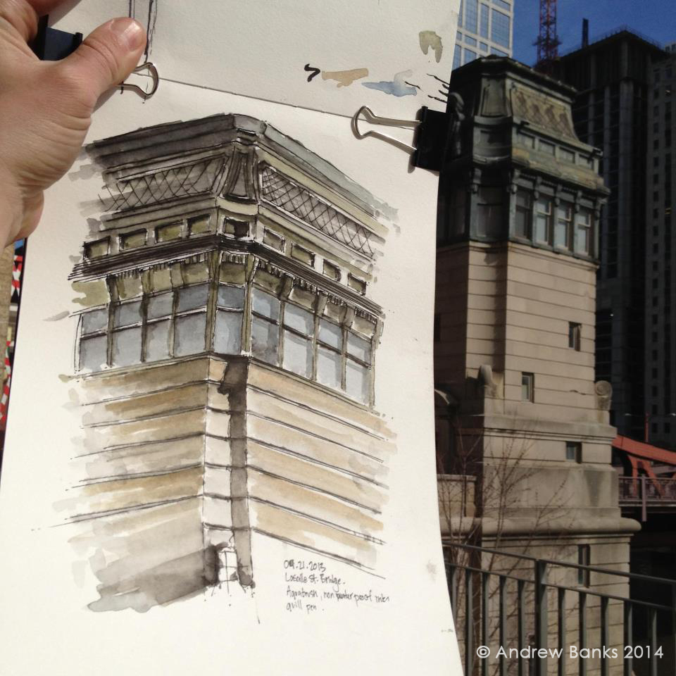 An on location watercolor sketch of the La Salle St. bridge house (© 2014 Andrew Banks).