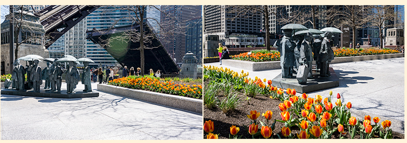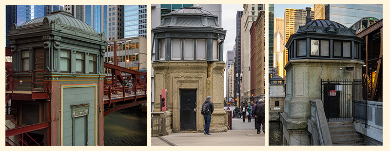 N. Wabash Ave. bridgehouses (L). N. State St. bridgehouses in the foreground & N. Dearborn St. bridgehouse in the background (R). It is not uncommon for visitors to interact with the "Gentlemen" (seen in both photos).